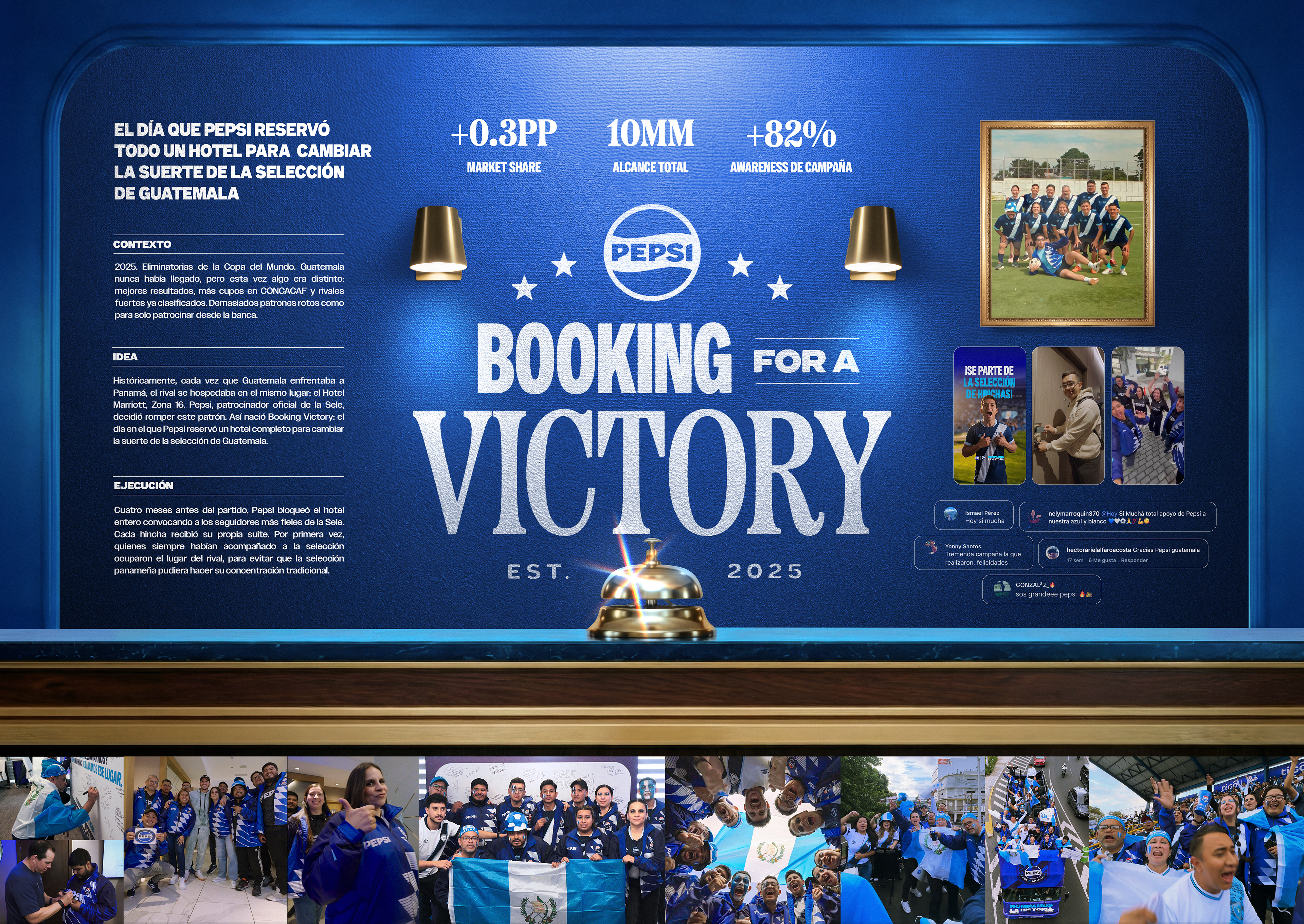 Una acción de Pepsi Guatemala que partió de una verdad incómoda: la Selección de Guatemala nunca había logrado clasificar a un Mundial, y durante años, cada vez que enfrentaba a Panamá, el rival se hospedaba en el mismo hotel… y siempre ganaba. No era una ventaja táctica, era una cábala que nadie cuestionaba. Así que decidimos romperla. Cuatro meses antes del partido, reservamos por completo ese hotel, disfrazando la acción como una concentración de aficionados. Obligamos a Panamá a cambiar su rutina, a perder su ritual, a salir de su zona conocida. Y en un contexto donde cada detalle pesa, logramos alterar el único patrón que nadie se había atrevido a tocar.