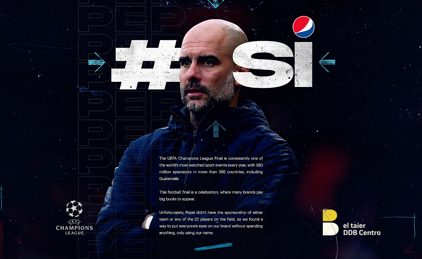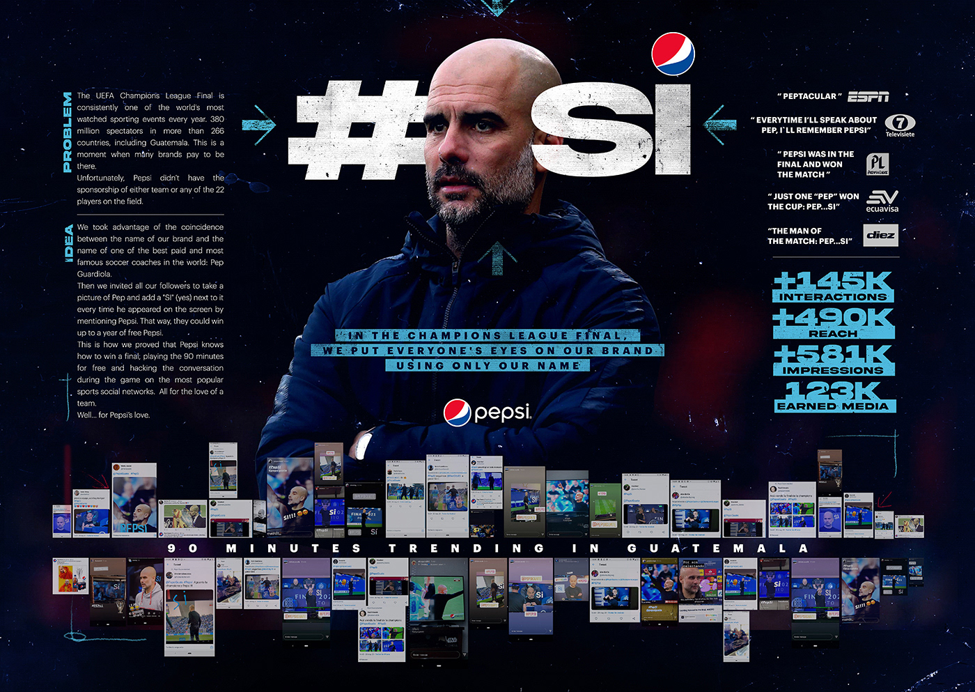 In the UEFA Champions League, we took advantage of the coincidence between the name of our brand and the name of one of the best paid and most famous football coaches in the world: Pep Guardiola. Being trending during the 90 minutes of the match, increasing the consideration of soccer fans and Pepsi lovers.